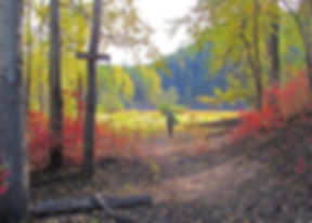 From Riverside Campground: Take Campground Trail to Jimmy Russell Road. Turn left and travel to the junction with Duck Pond Trail. Turn right on Duck Pond Trail and follow it up the gravel road and into the forest. Pass the junction with Apache Trail and turn right at the junction with Skid Road (trail). A pleasant walk on single track takes you to the junction with Keiver Way and the pond. One way is about 3.5 kms, and there is a 200-metre elevation gain.